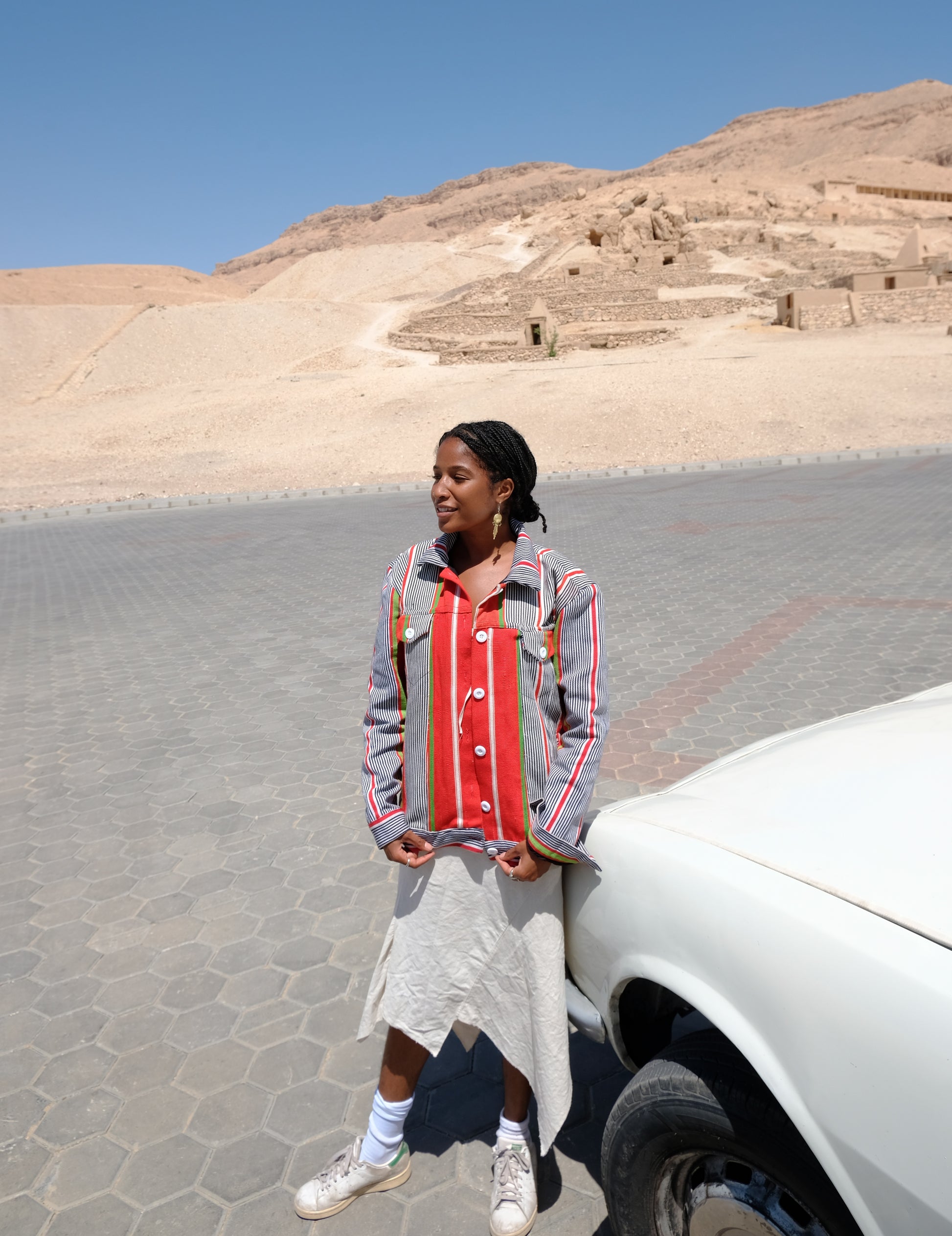 Every jacket starts in Wa, Northern Ghana, where skilled artisans hand-weave strips of Fugu cloth using traditional methods passed down for generations. The fabric is then sent to local tailors in Accra, where it’s cut and sewn to order—ensuring ethical labor, zero overproduction, and deep respect for heritage.