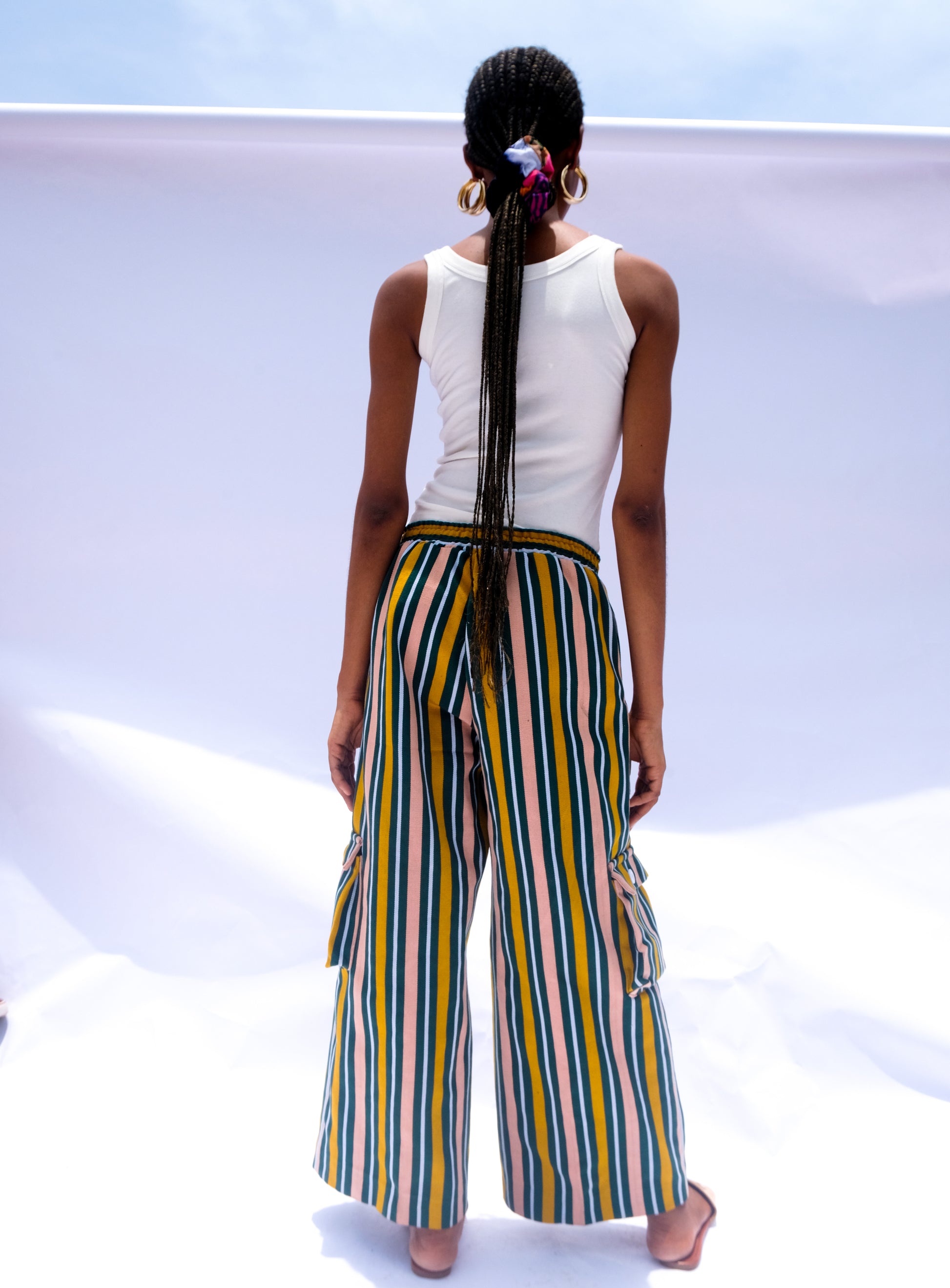 Made from 100% handwoven Fugu cloth, this fabric has a structured, durable feel that softens slightly with wear. It holds its shape beautifully, giving the pants a clean, tailored drape without clinging. The texture is rich and tactile—substantial enough to wear across seasons, yet breathable thanks to the open weave of the cotton threads. It’s the kind of cloth that feels rooted, strong, and full of story. The relaxed cut and mid-rise waistband make them a go-to for days you want to look good and feel even better.