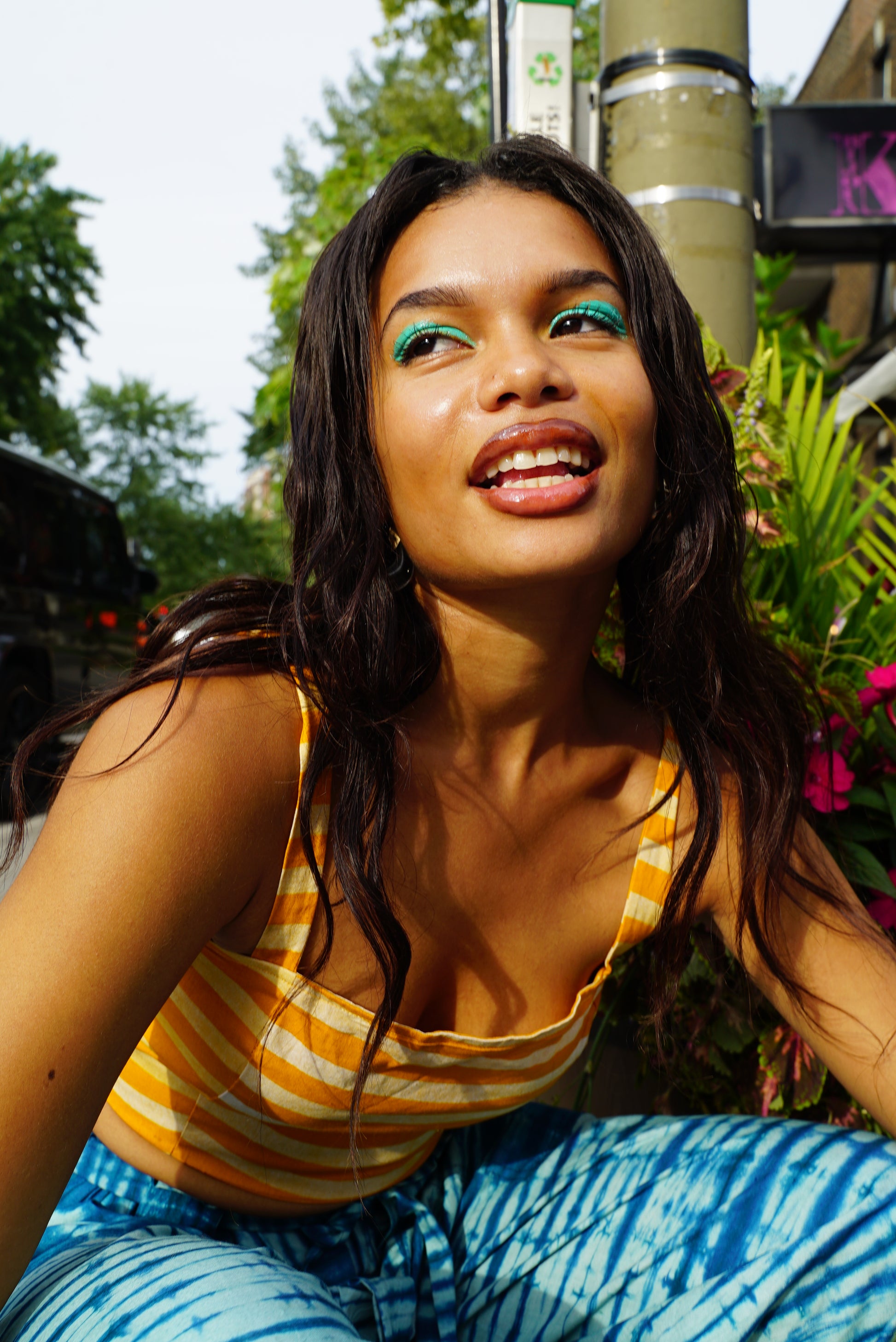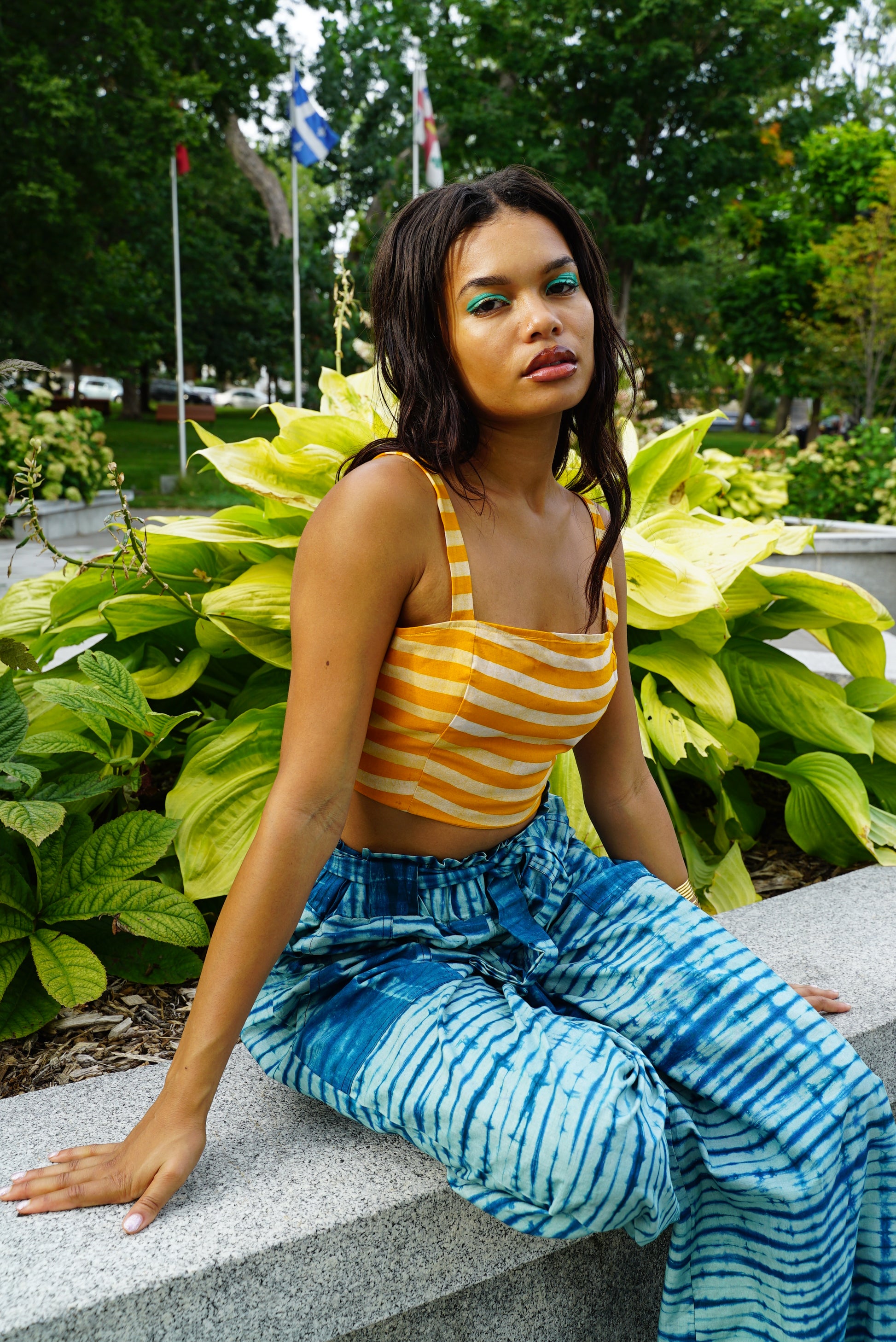 Our take on the square neckline tank top. Ties at back so it’s very comfortable! Princess seam at bust for flattering shape. Cropped length that looks great with high-waist jeans.