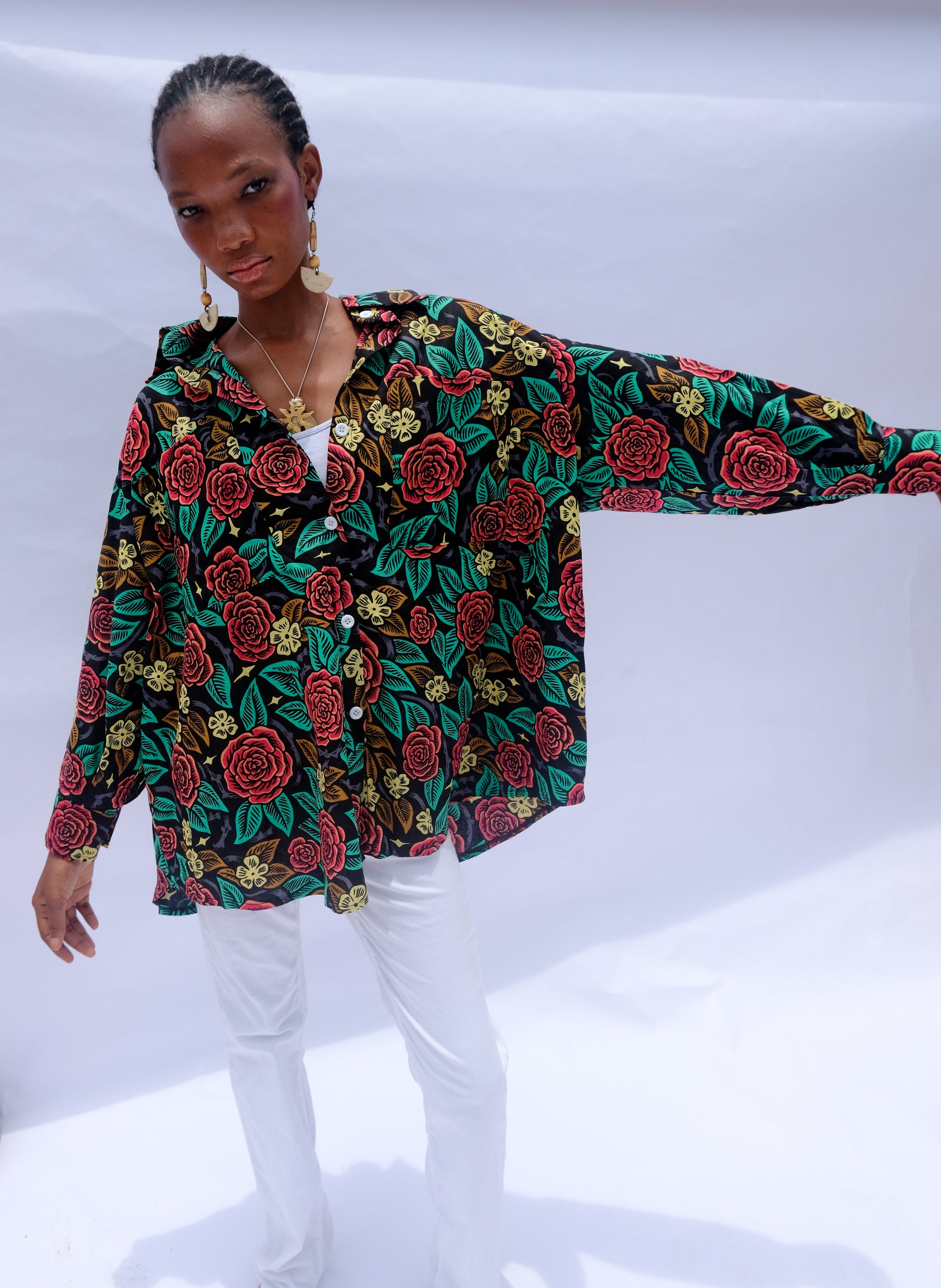 This oversized top is all about versatility and ease—wear it unbuttoned over a tee as a lightweight layer or buttoned up with jeans or tights to make a statement all on its own. The wide cuffs can be worn loose or rolled up, and the oversized chest pockets add function and flair. With all this extra fabric, you really get to showcase the richness of this stunning print.