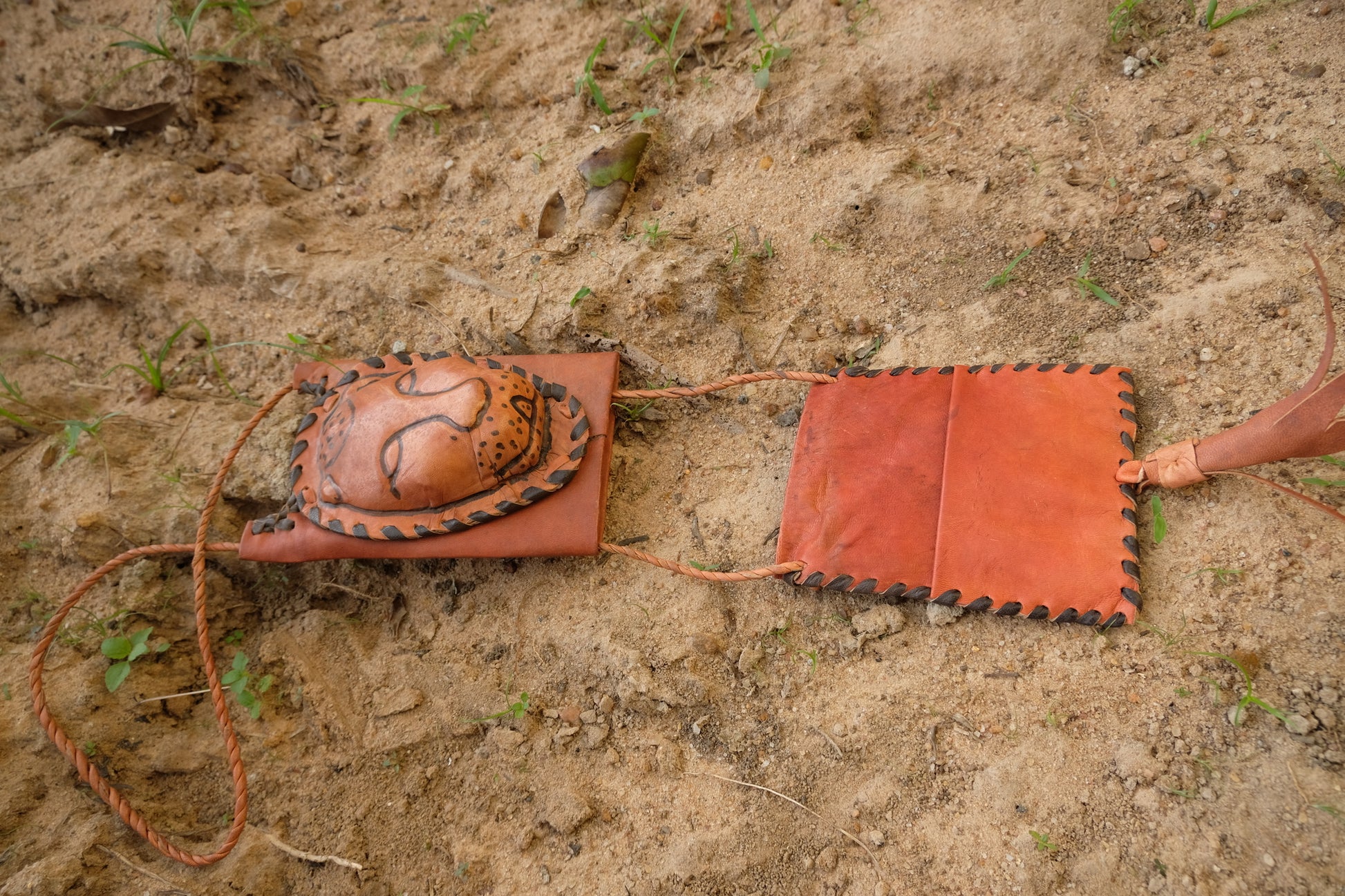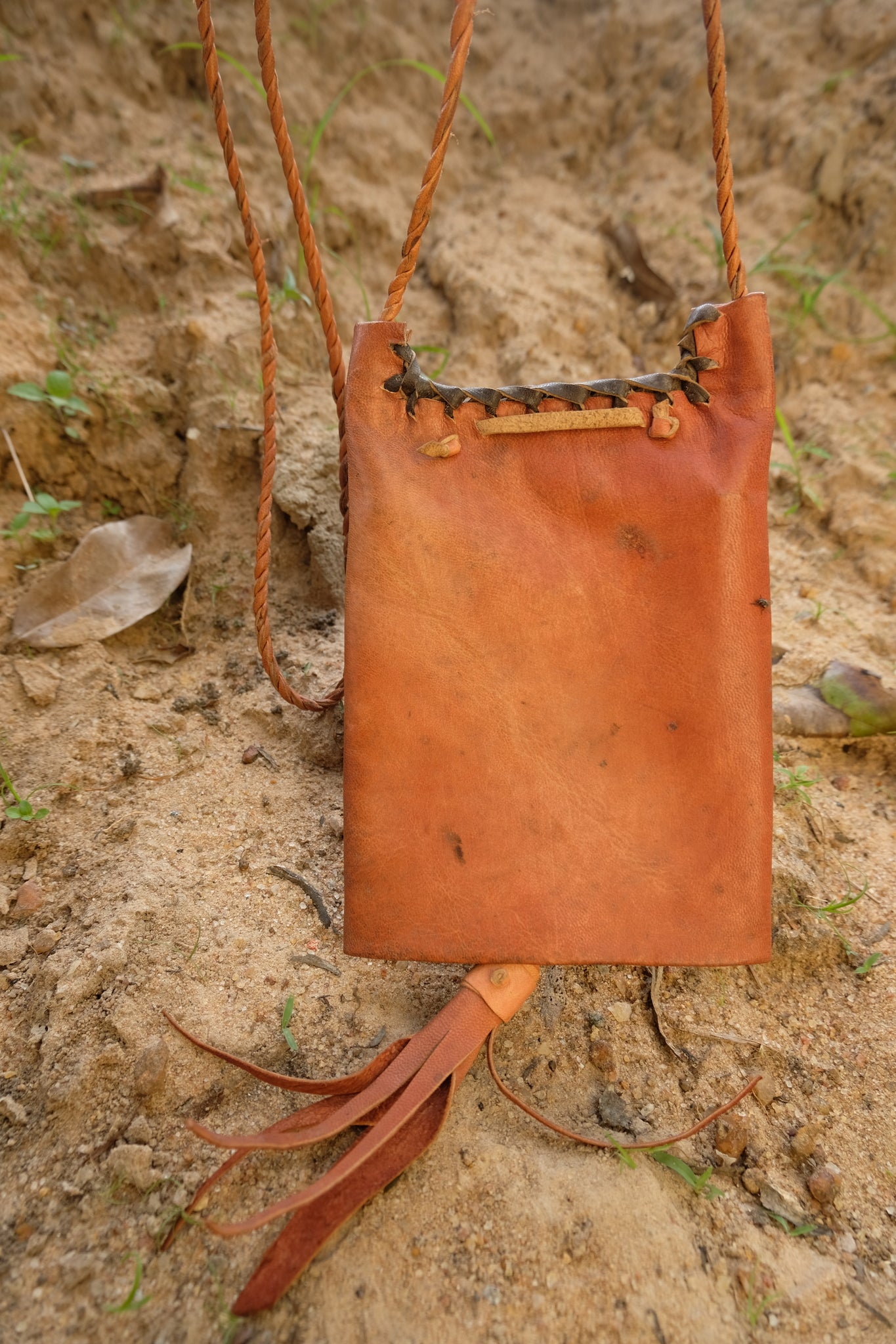 This rustic, 100% genuine leather pouch purse features a hand-painted lion face decoratively sewn. Intricately sewn border with contrasting black leather and delicate tassel at the base for artisanal detail. The interior pouch easily slides out and fits small things like your passport, keys or some change. It has an additional pocket. All held together by a braided leather strap.