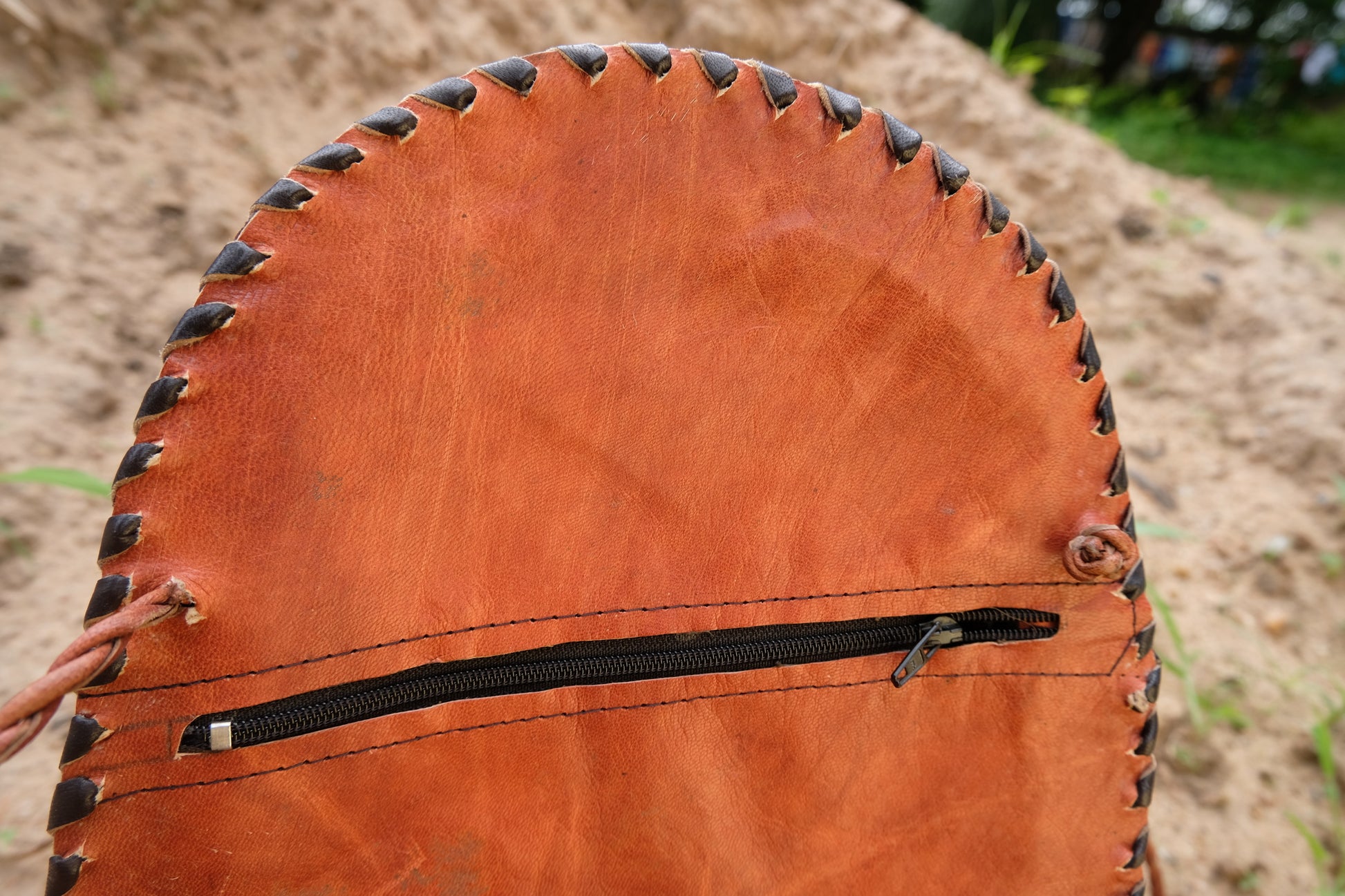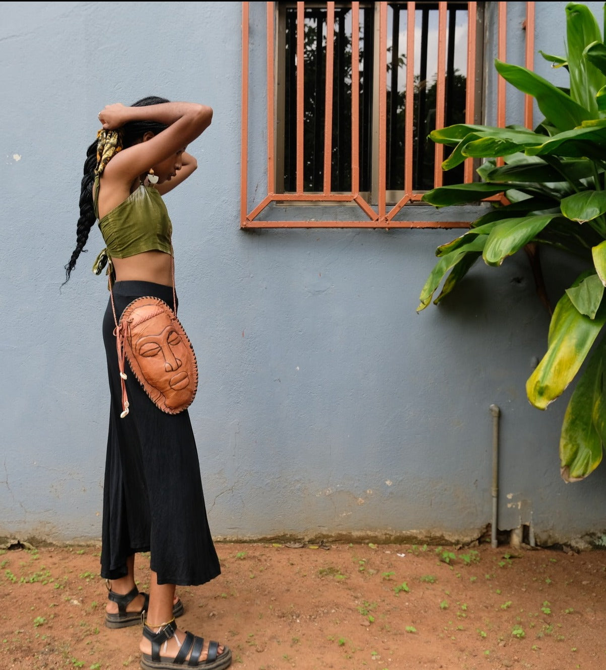 Gorgeous hand-painted genuine leather mask bag featuring leather tassels beaded with cowrie shells on its ends. Braided leather straps and frontal detailing. Intricately sewn border with contrasting black leather for artisanal detail. Secret zipper opening at the back to fit everything in its spacious interior.