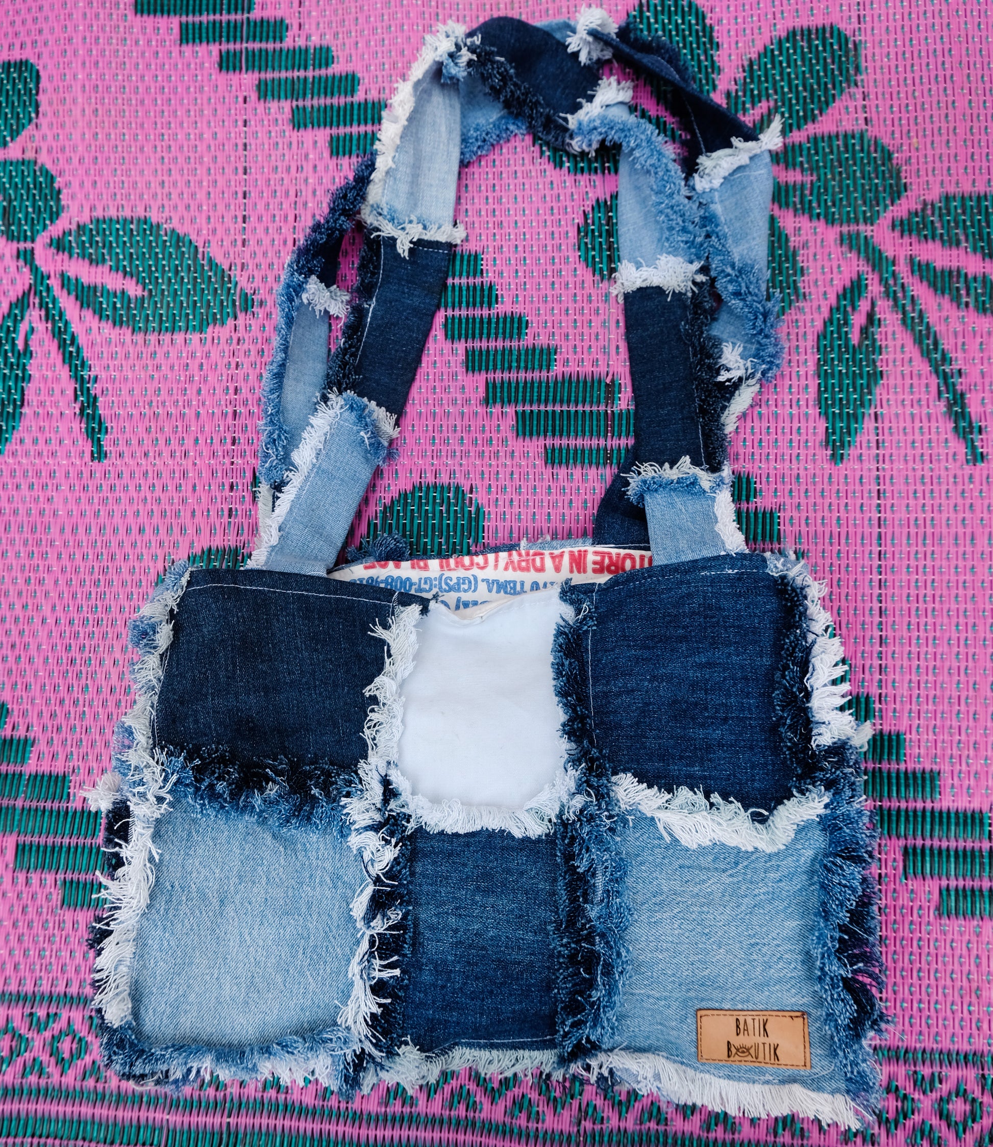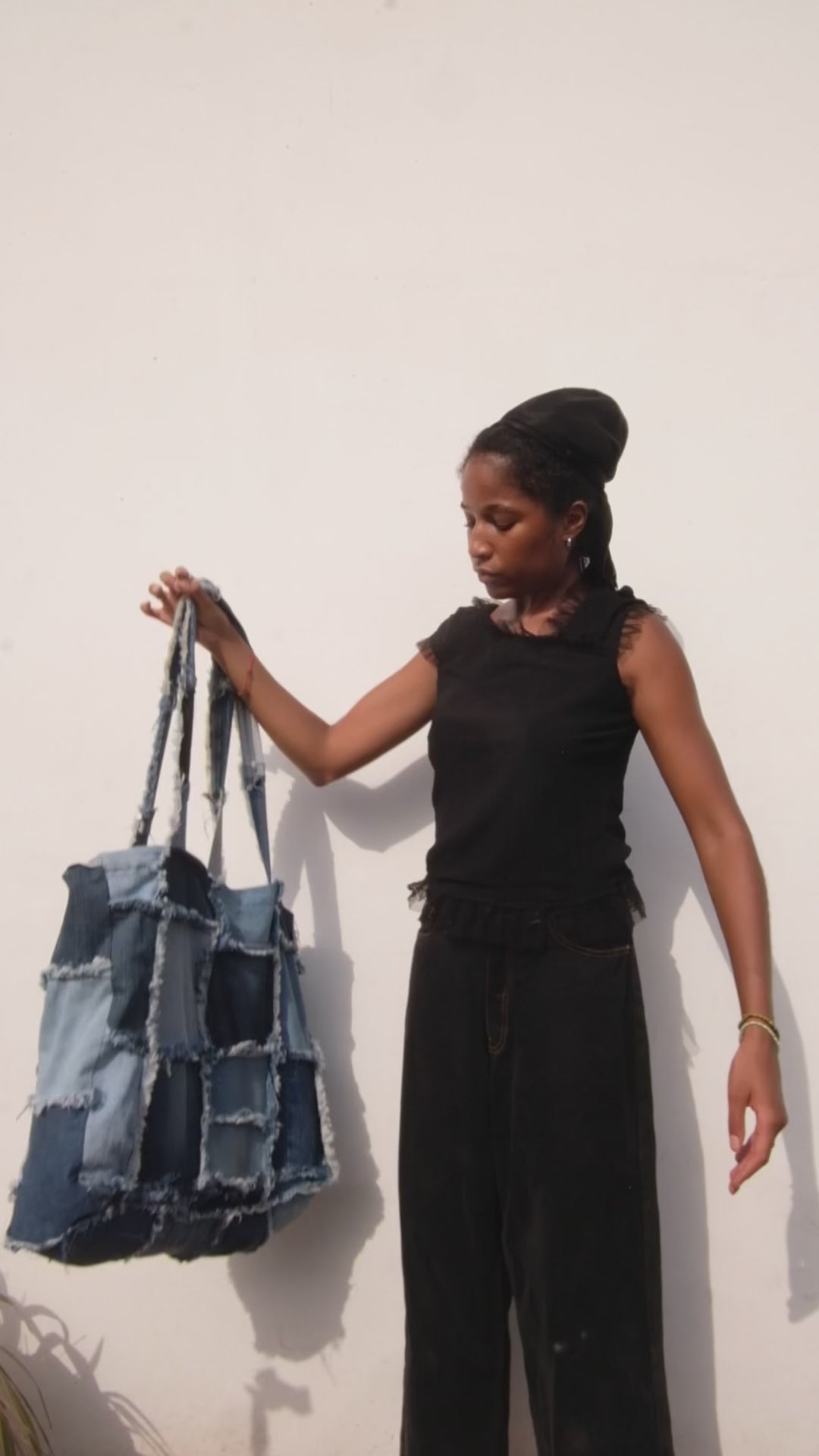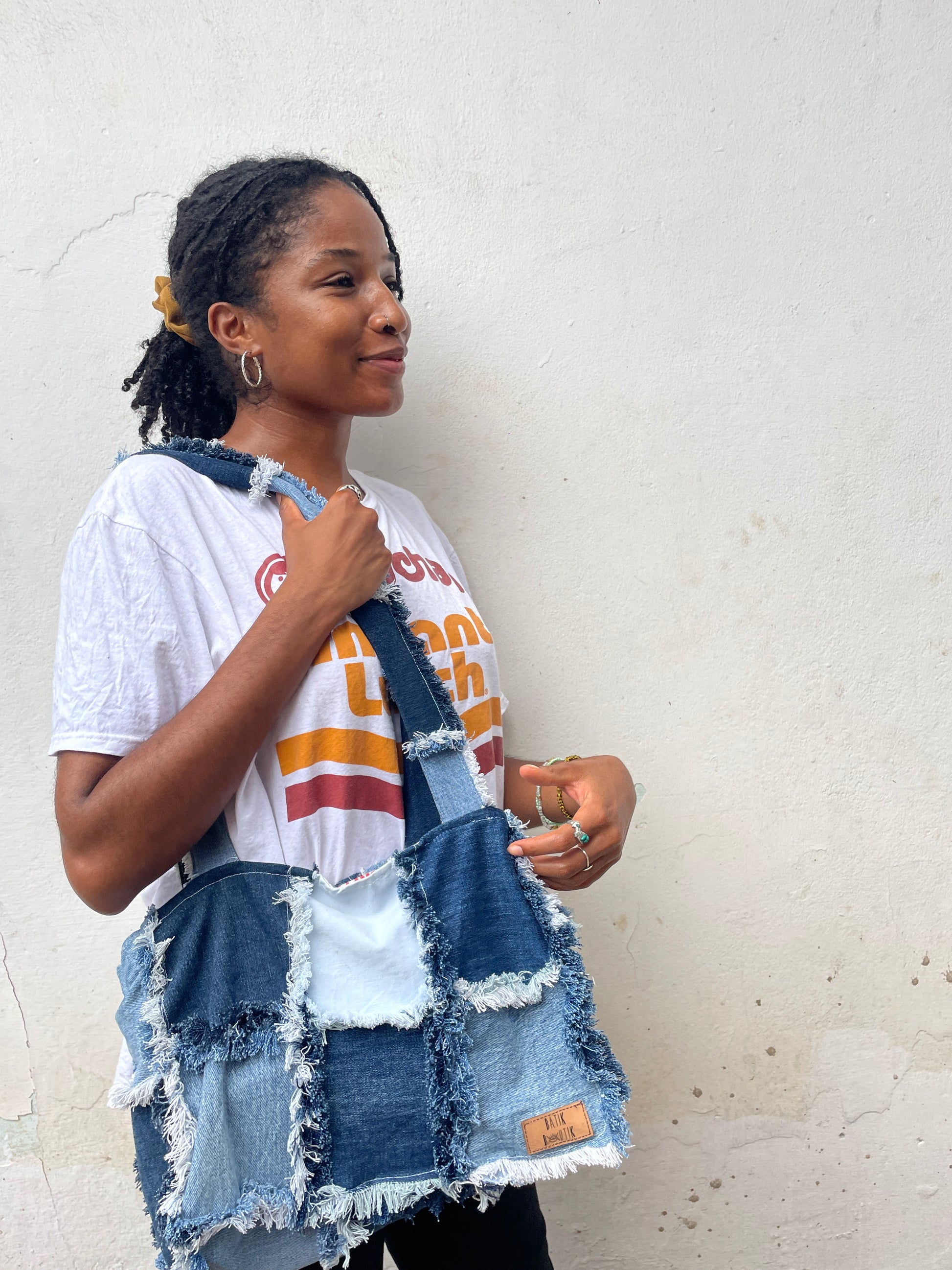 In efforts to curb textile waste and spread awareness of an environmental crisis in Ghana, we've been sourcing old jeans from Kantamanto Market in Accra and repurposing them into these beautiful new denim bags! Carefully stitched by our artisan community and fully lined with cotton flour sacks, featuring a frayed hem.