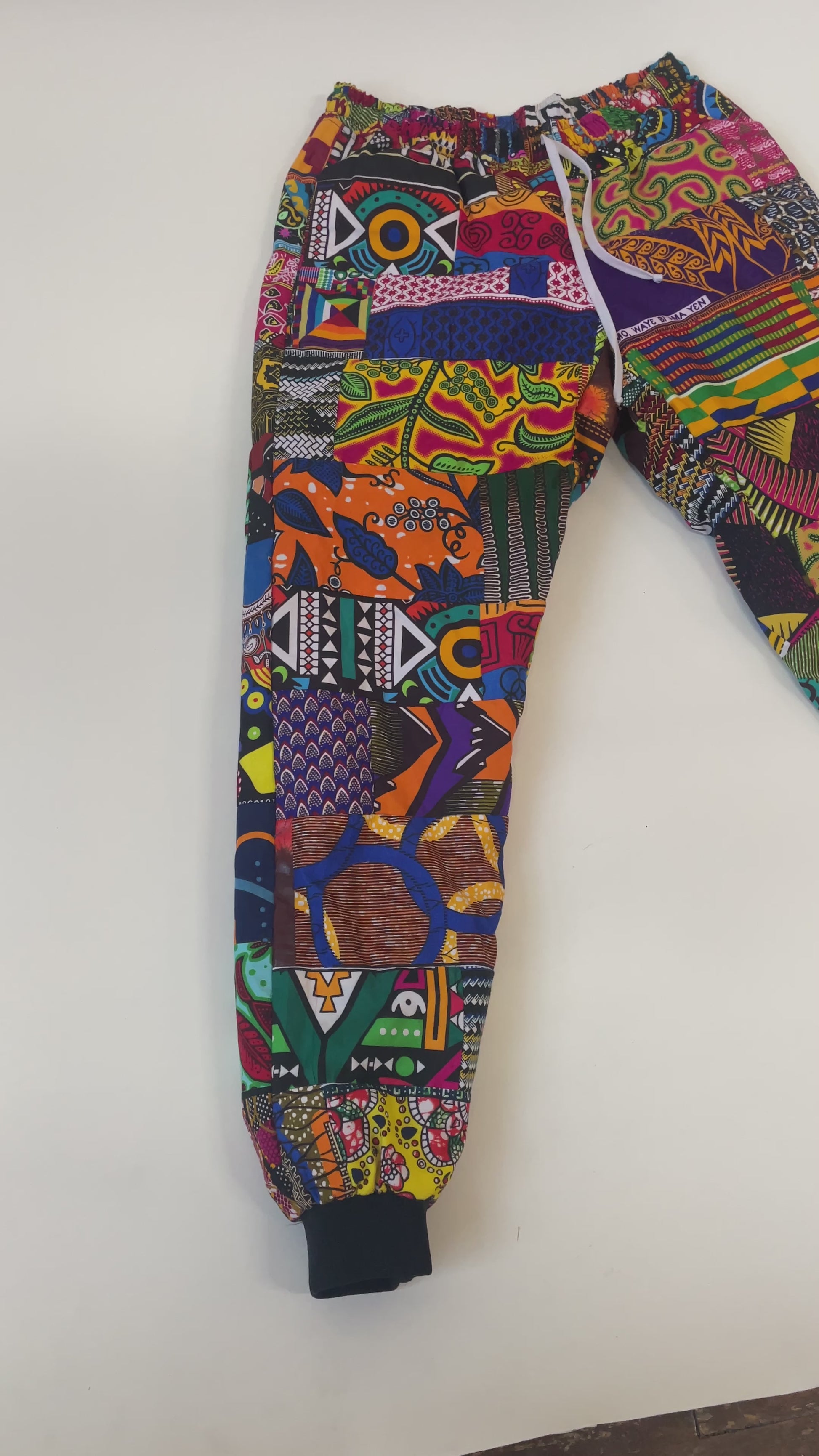 These amazing unisex pants fit stylishly baggy and tapers at hem in a harem or jogger style. This new and improved design features a comfortable wide elastic waistband with drawstrings for adjusted comfort and a cozy interior lining. Brilliant patch-worked designs all done by hand in Ghana using off-cuts of fabrics to reduce textile waste and ensure brilliant uniqueness. Each pair is completely different. Front and back pockets.