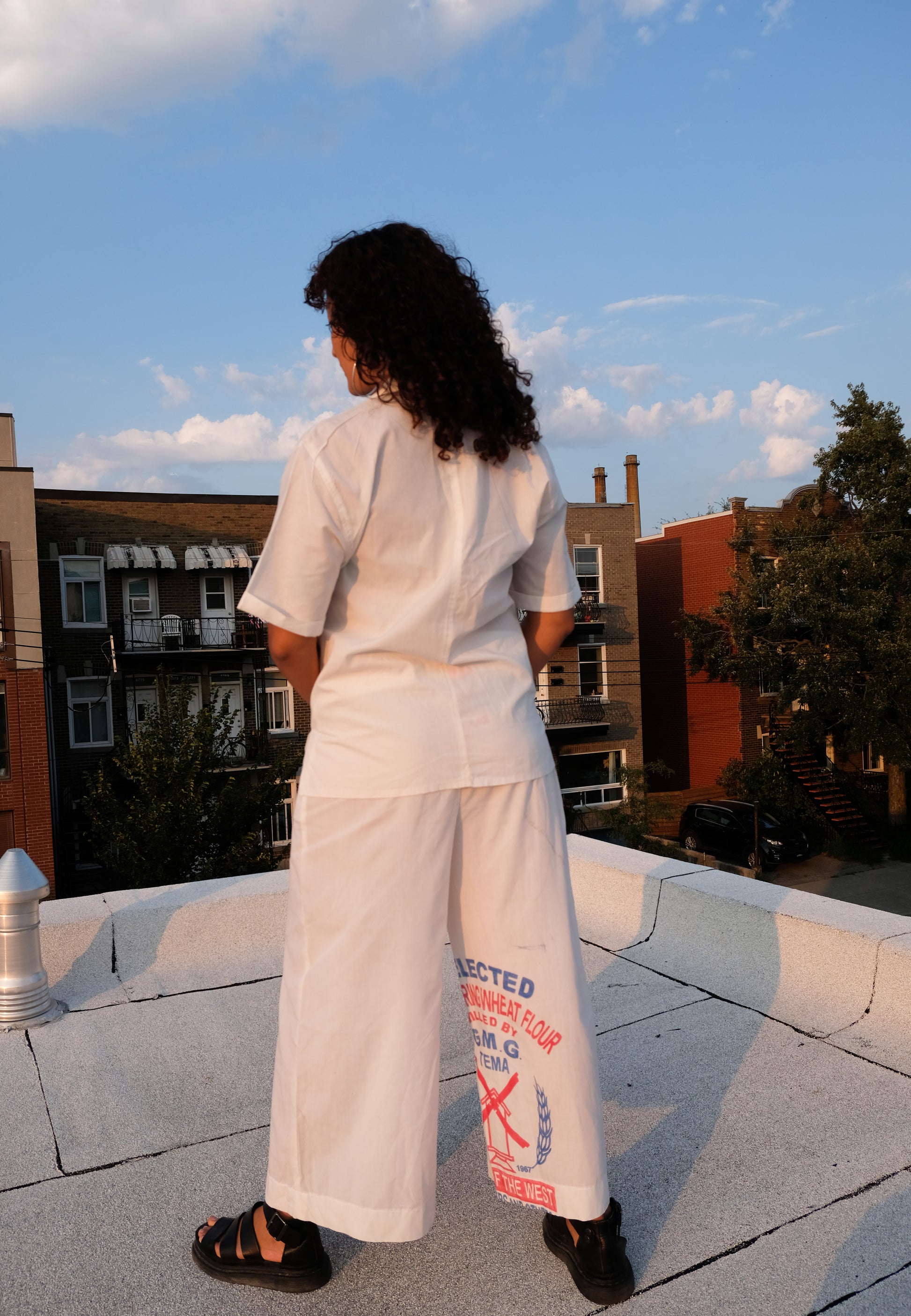 Our new Recycled Flour Sack Pants are made from 100% cotton bags used for flour sourced in Ghana. In efforts to mitigate waste we have transformed them into pants using our ACCRA Pants design!
